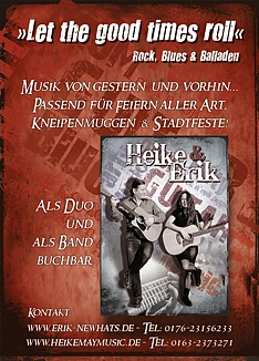 Download Pressefoto "Heaven´s Company" Tipp: anklicken mit rechter Maustaste, Verlinkten Inhalt speichern unter Heike & Erik Zwei Gitarren mit zwei einzigartigen Stimmen (oder) Good Vibes »Let the Good Times Roll« ist bei jedem ihrer Auftritte mehr als nur Motto. Sie wollen mitklatschen, Freude haben und mitsingen? Da sind Sie bei Erike Heyner und Heike May genau richtig! Wir haben Spaß beim musizieren und singen. Unser Anspruch ist es, dass auch Sie dieser Spaß in kürzester Zeit erreicht. Das Repertoire ist breit angelegt und bietet von Pop und Blues - bereichert durch eigene Songs - alles, was jede Party unvergessen macht, von rockigem Vollgas-Sound bis zur tiefgreifenden Rockballade. Lassen Sie sich von der einzigartigen Heike May verzaubern. Ihre Stimme vereint die unterschiedlichsten Stilrichtungen aus den Elementen des Gospels, Blues, Rock und Soul. Dieser unverwechselbare Gesang hauchte schon vielen verschiedenen Bands einen unvergessenen Sound ein. Erik Heyner, der Leipziger »Chris Rea« bereichterte ebenfalls seit Jahren mit seinen Stimmvolumen die unterschiedlichsten Bands. Egal ob Stadtfest, Jubiläum, Firmenfeier oder einfach nur Party, Erik Heyner & Heike May sind flexibel und können sich jeder Situation und jedem Wunsch anpassen. Aber auch für kleine intime Feieren sind Erik Heyner & Heike May die richtige Ergänzung, die diese unvergessen macht. Sie passen auch bei beengten Räumlichkeiten in jede noch so kleine freie Ecke und erfüllen den Raum mit ihren Sound. Das Duo nimmt Sie mit auf Ihre persönliche Reise und Sie werden Raum und Zeit während des Auftritts vergessen. Wenn Sie Ihre Nachbargemeinde oder Ihren Nachbarn noch mehr beeindrucken wollen, Erik Heyner und Heike May sind auch als Band buchbar. Dann werden diese zwei Ausnahmekünstler noch von Uwe Thomas (Bass) und Felix Katschinka (Percussion, Schlagzeug) begleitet.