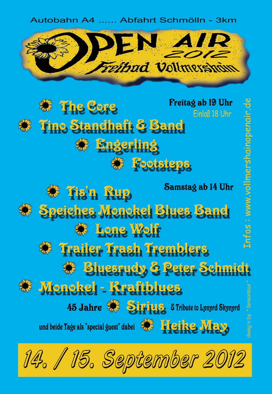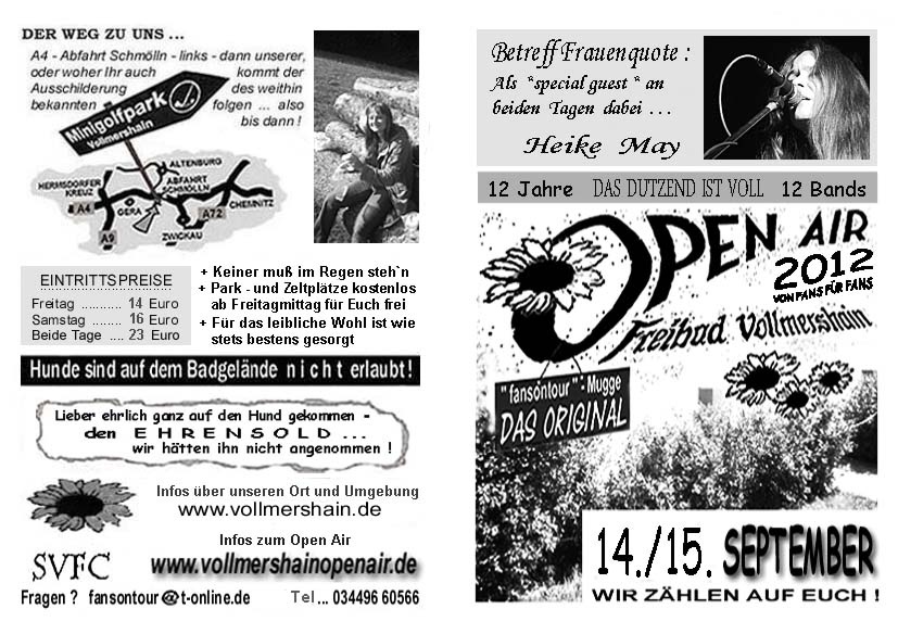 | Sa. | 10.07. | Oettersdorf open air bei Schleiz, A9 Abfahrt Dittersdorf, an der B2 siehe Plakat der Veranstaltung Infos im Web | t.b.a. |