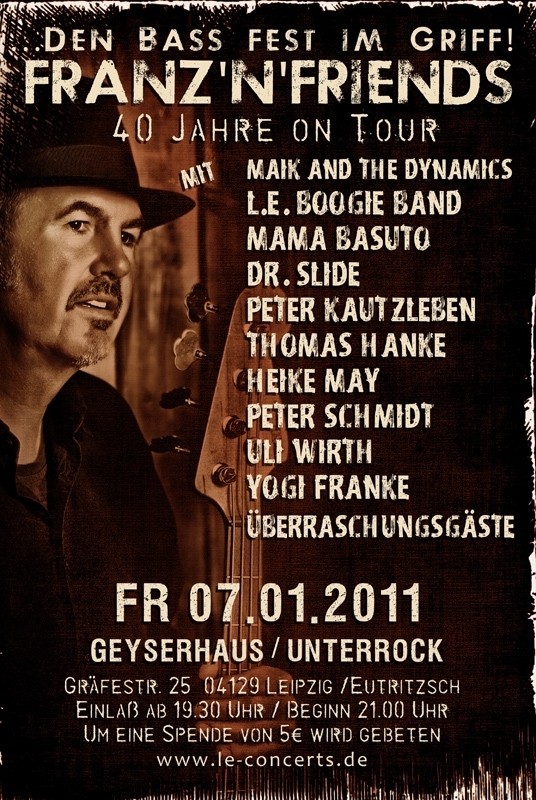 | Do. | 31.12. | Eutritzsch, GeyserHaus, UnterRock, Bluessilvester, Erik & The New Hats feat. Heike May & Jogi Franke | 20.00h |