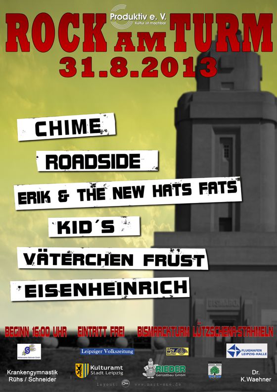 | Sa. | 07.08. | 04159 Lützschena, Bismarck-Turm "Rock am Turm" unter anderem mit Amok, M.I.L.C.H. mit Christiane Ufholz, Peters Deal, Wayne, Your Bruise, Karmagold und der Siegerband von "Jugend groovt" | 16.00 Uhr |